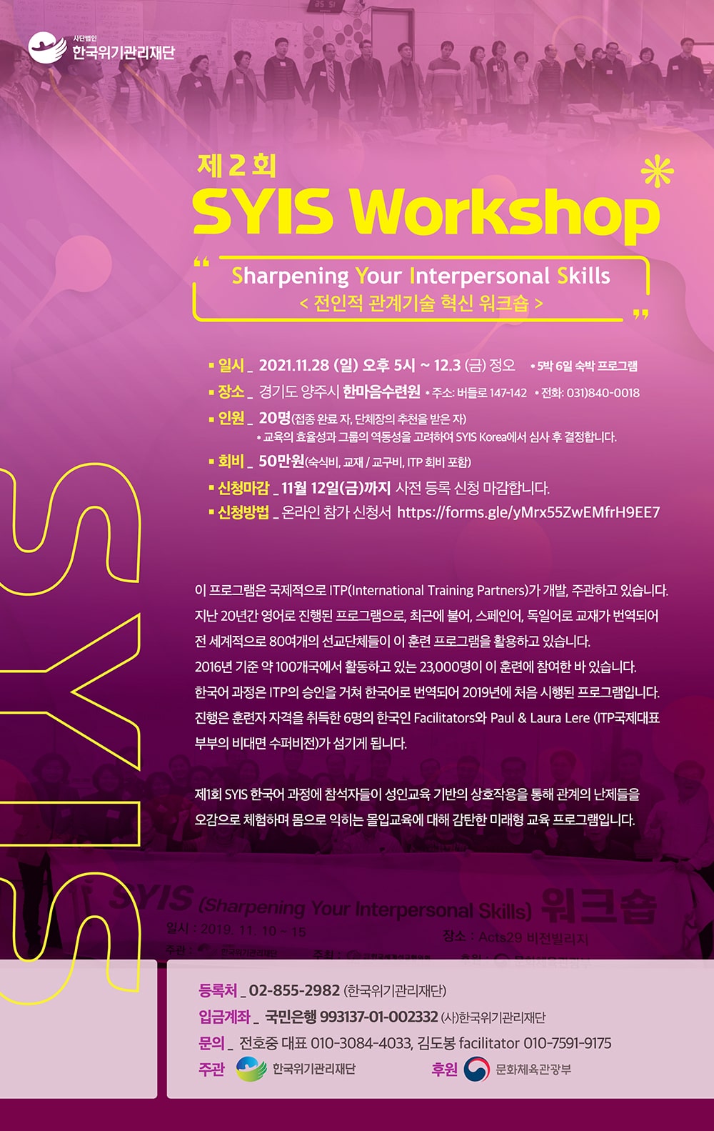 제2회 SYIS 워크숍에 초대합니다. 2021.11.02 22:58 KMCN 소식 [신청하기] 제2회 SYIS 워크숍에 여러분을 초청합니다. 일시 : 2021년 11월 28일(주일) 오후 5시 ~ 12월 3일(금), 5박6일 숙박 프로그램 장소 : 한마음수련원(버들로 147-142) 인원 : 20명 회비 : 50만원 신청 기간 : 11월 12일까지 사전 등록 신청 마감합니다. [신청하기] 공유하기 게시글 관리 한국선교사 멤버케어 네트웍 저작자표시 비영리 변경금지 (새창열림) 'KMCN 소식' 카테고리의 다른 글 KMCN 매거진 제3호 (0) 2022.02.28 KMCN 매거진 제2호 (0) 2021.12.31 KMCN 매거진_창간호 (1) 2021.10.31 아무튼! 멤버케어_교육 2단계 (0) 2021.10.26 2021년 선교사 멤버케어교육- 멤버케어를 부탁해 (0) 2021.06.04 댓글 공유하기 다른 글 댓글 이 글 공유하기 구독하기 구독하기 카카오톡 카카오톡 라인 라인 트위터 트위터 Facebook Facebook 카카오스토리 카카오스토리 밴드 밴드 네이버 블로그 네이버 블로그 Pocket Pocket Evernote Evernote 다른 글 KMCN 매거진 제3호 KMCN 매거진 제3호 2022.02.28 KMCN 매거진 제2호 KMCN 매거진 제2호 2021.12.31 KMCN 매거진_창간호 KMCN 매거진_창간호 2021.10.31 아무튼! 멤버케어_교육 2단계 아무튼! 멤버케어_교육 2단계 2021.10.26 다른 글 더 둘러보기