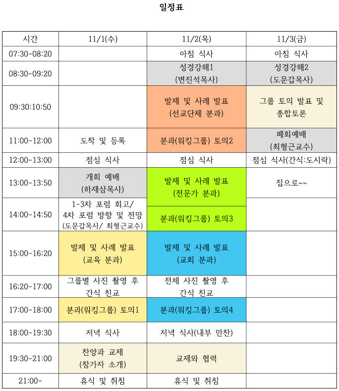 제4차 포럼에서는 팬데믹 사태로 침체되었던 선교사역의 활성화를 기대하면서, 교회, 선교단체, 케어 전문가 그룹, 교육 분과 등 4개 워킹그룹별로 지난 사역을 점검하고, 새로운 사역 과제를 설정하게 될 것입니다. 이번 포럼을 통해, 각 워킹그룹이 선행적이고 창의적으로 멤버케어 사역을 개발하고 실행하는 네트워크로 자리잡을 수 있기를 기대하고 있습니다. 결실의 계절 11월 첫 주간에, 각 분야에서 섬기고 계신 리더들과 멤버케어 사역자들과의 반가운 만남을 기대하고 환영하며, 여러분들을 제4차 멤버케어 포럼에 초대합니다.