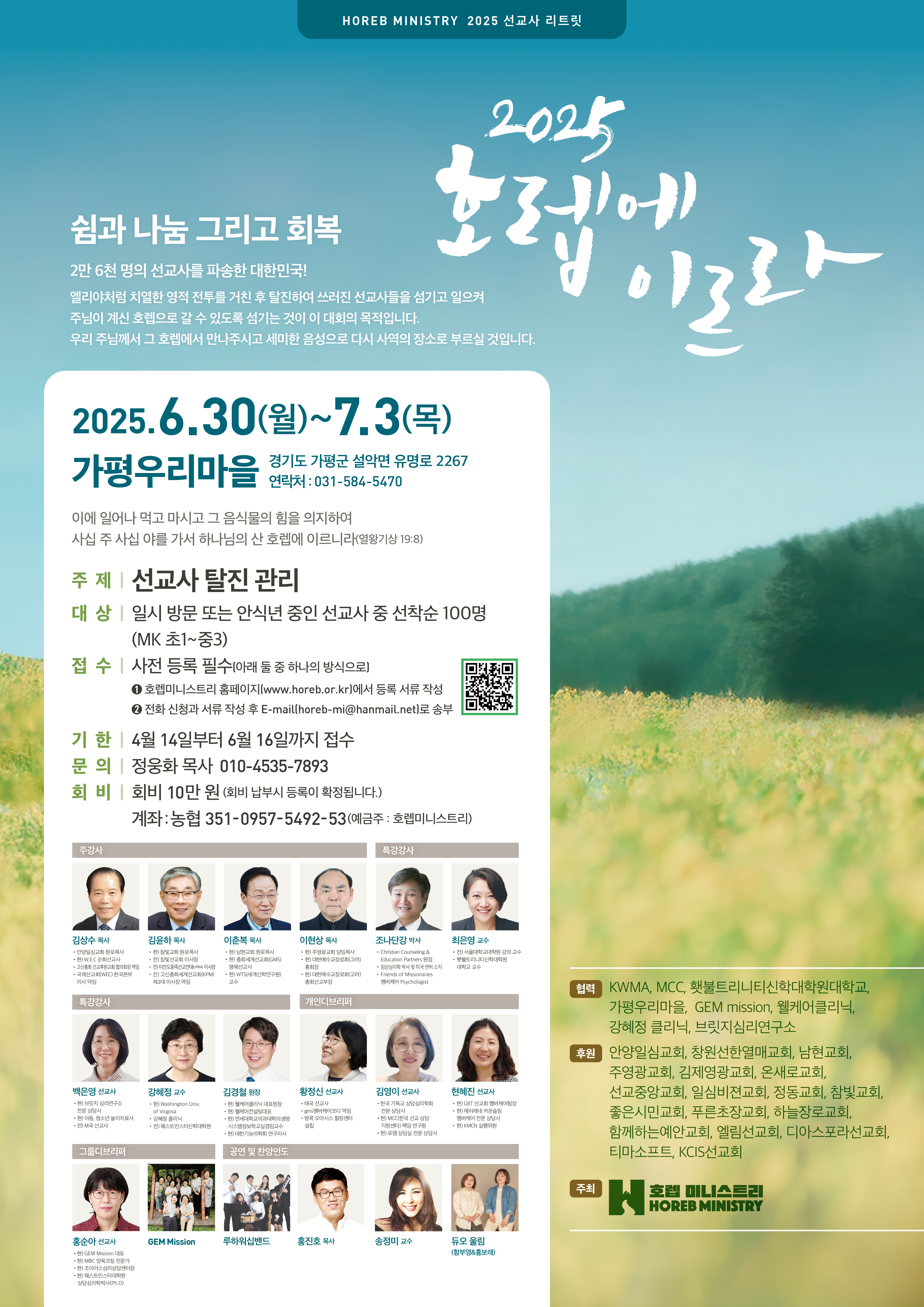 2025년 선교사 리트릿 안내(호렙 미니스트리) 2025.04.17 16:17 KMCN 소식 매년 호렙 미니스트리는 안식년 또는 일시 귀국한 선교사를 위해 '선교사 리트릿'을 운영하고 있습니다. 올 해에도 '선교사 탈진 관리'를 주제로 좋은 프로그램으로 준비하였습니다. 많은 참여 바랍니다. 신청하기 : https://forms.gle/1phqpBLUHPiUAuDF8 공유하기 게시글 관리 한국선교사 멤버케어 네트웍 저작자표시 비영리 변경금지 (새창열림) 'KMCN 소식' 카테고리의 다른 글 Soul care 지원그룹 안내 (0) 2025.08.14 “멤버케어를 품다” 3단계 교육 과정 모집 (0) 2025.08.01 2025 멤버케어자를 위한 2차 세미나 : 멤버케어를 the 하다 (0) 2025.03.10 멤버케어자를 위한 2차 세미나 : 멤버케어를 풀다 (0) 2023.08.27 KMCN 매거진 제7호 (0) 2022.11.05 댓글 공유하기 다른 글 댓글 이 글 공유하기 구독하기 구독하기 카카오톡 카카오톡 라인 라인 트위터 트위터 Facebook Facebook 카카오스토리 카카오스토리 밴드 밴드 네이버 블로그 네이버 블로그 Pocket Pocket Evernote Evernote 다른 글 Soul care 지원그룹 안내 Soul care 지원그룹 안내 2025.08.14 “멤버케어를 품다” 3단계 교육 과정 모집 “멤버케어를 품다” 3단계 교육 과정 모집 2025.08.01 2025 멤버케어자를 위한 2차 세미나 : 멤버케어를 the 하다 2025 멤버케어자를 위한 2차 세미나 : 멤버케어를 the 하다 2025.03.10 멤버케어자를 위한 2차 세미나 : 멤버케어를 풀다 멤버케어자를 위한 2차 세미나 : 멤버케어를 풀다 2023.08.27 다른 글 더 둘러보기