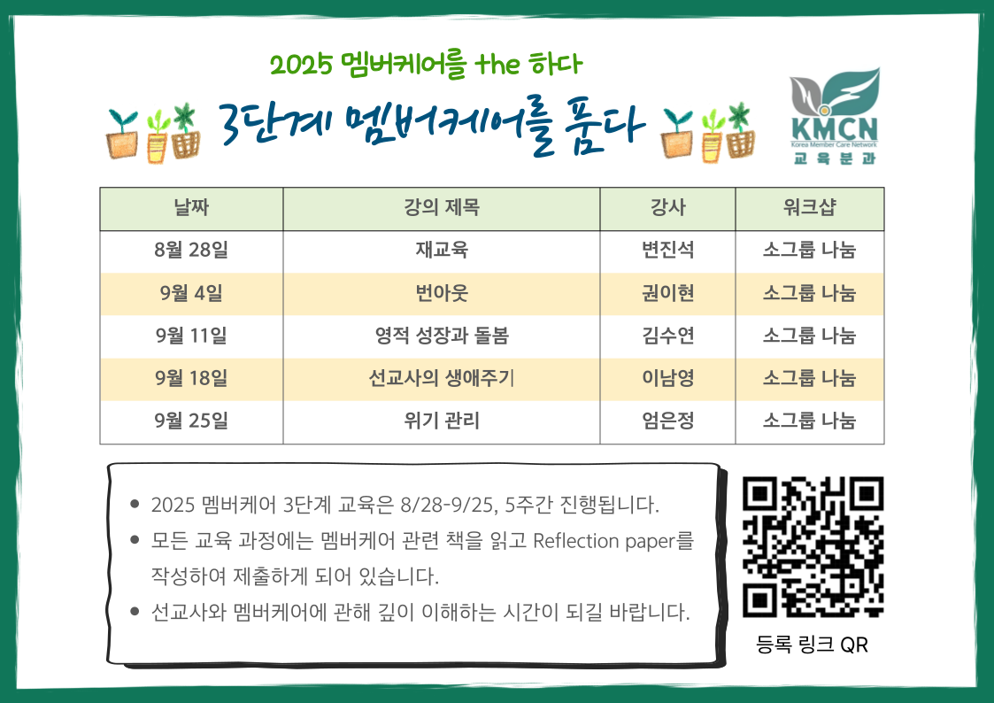 선교사와 멤버케어에 대한 더 깊이 있는 이해가 있는 시간이 되길 기대하며 교육분과에서 기도로 준비하고 있습니다. 많은 관심과 등록 부탁드립니다. 오늘도 주님의 평안이 이곳에 계신 모든 분들께 함께 하길 기도합니다.